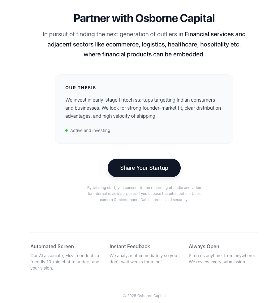 Some founders will hate it - I’m well aware of this. And they’re not wrong to. Getting funded is deeply personal. Pouring your vision into a conversation with an AI agent, knowing a machine is making the first cut on your life’s work, can feel dehumanizing. For founders who’ve been building relationships in the ecosystem, this might feel like a step backward.
