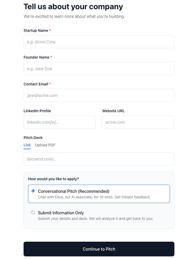 The founder can submit their pitch details as regular, but then they also have the option to pitch to Eliza immediately.