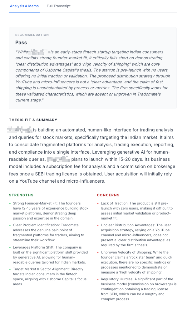 The conversation takes 5-7 minutes. At the end, I get a structured analysis and a preliminary recommendation on whether this opportunity aligns with my investment thesis. Currently, as its in experimentation stage, I’ve opened up the final analysis to the founder as well.