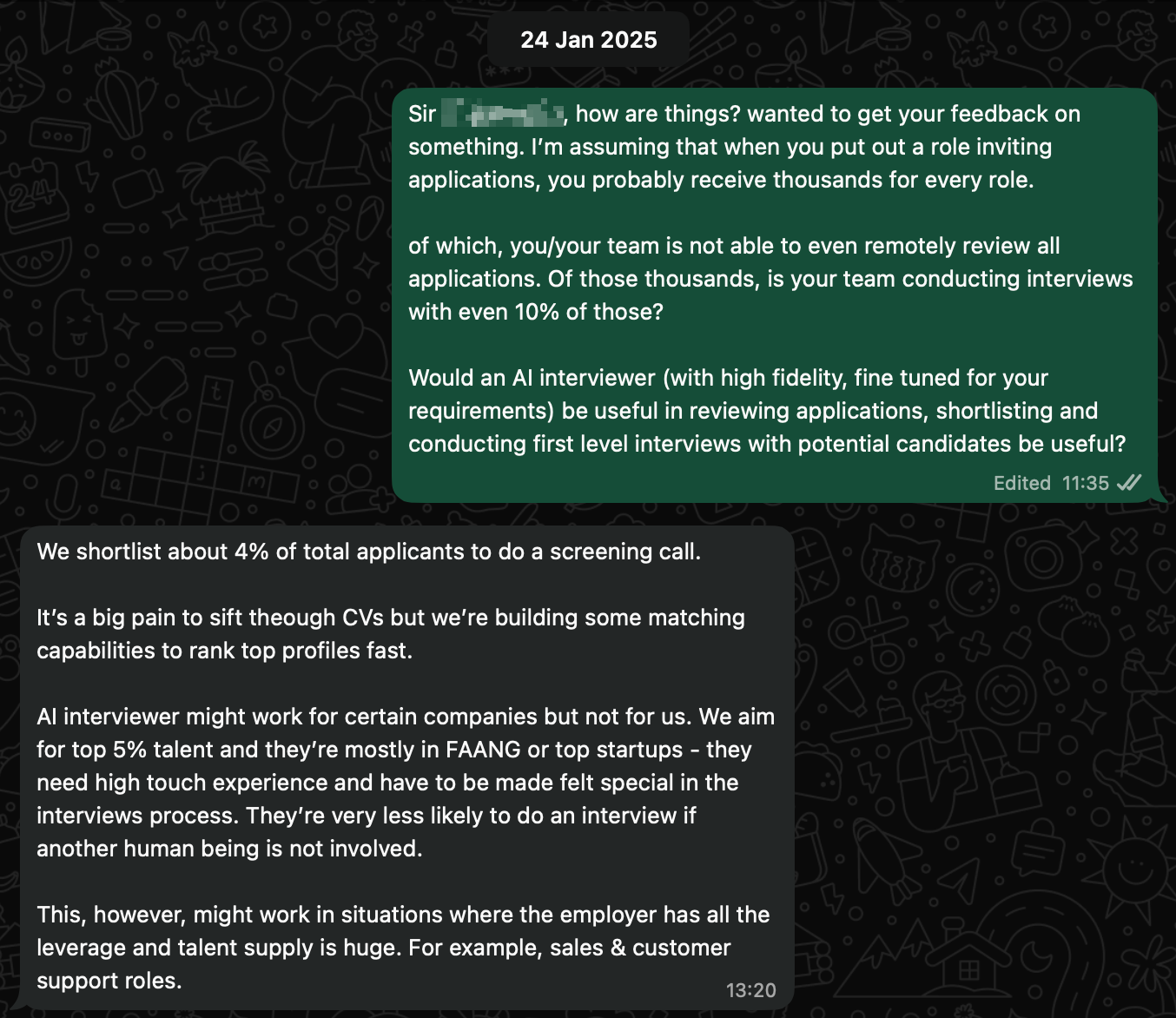 Here’s the dichotomy: Early 2025, I reached out to my friend for a random brainwave I was having regarding AI interviewers. He was and is spot on. If I’m targetting the top 5% founder talent, that talent will be thrown off if the interviewer is not a human. The top 5% talent needs to be made to feel special. I’m being super mindful of this.