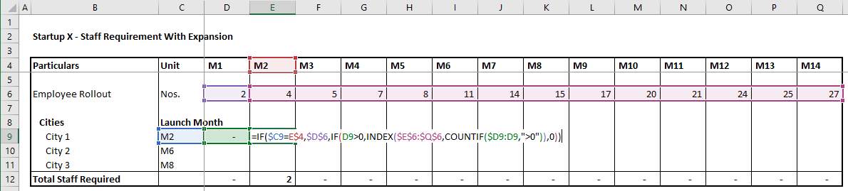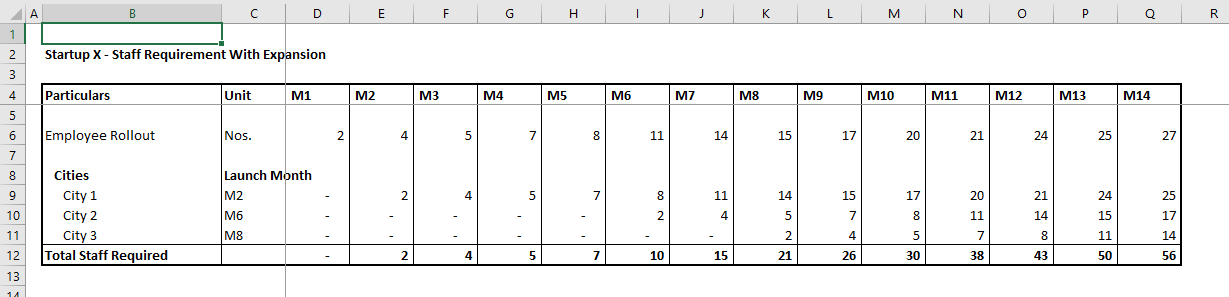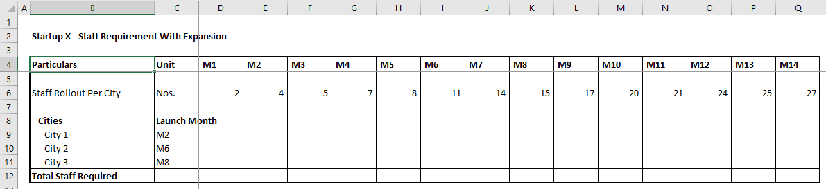Example: Consider an example where Startup X will commence operations in city “City 1” in month “M2”. It will begin hiring as per the requirement stated in “Row 6”, starting from cell E9 onward. Therefore, the staff requirement for “City 1” will be cell E9=2, F9=4,G9=5… and so on. Similarly for Cities 2 & 3 as per the launch months of “M6” and “M8” and staff roll out in City 2 will begin from M6 onward and City 3 from M8 onward.