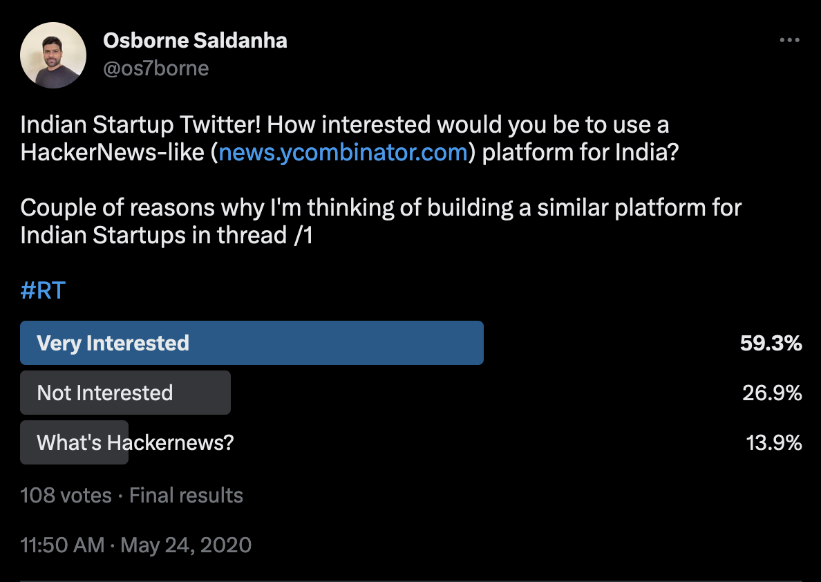 Looking for existing platforms in India bore no fruit. So I thought, why not launch it myself. I sat over the idea for a couple of weeks - to make sure it was not a random itch. After some thinking, I thought of doing a dip stick survey on twitter with it’s native voting tool which is 100% legit.