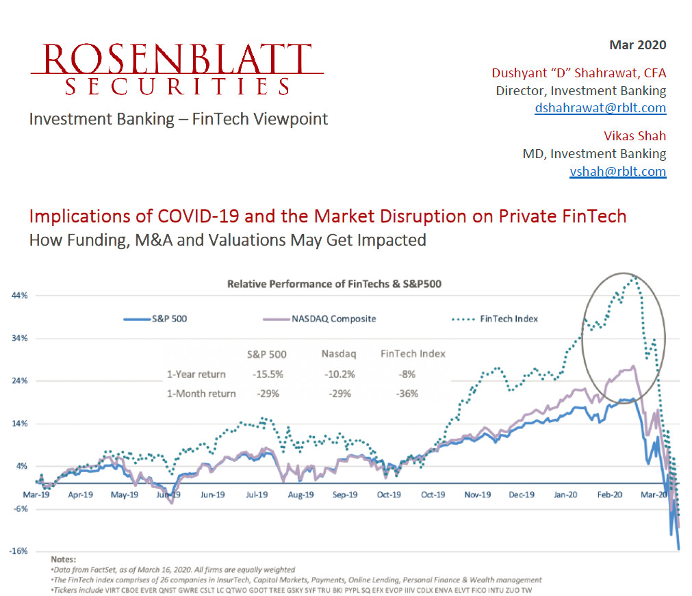 Rosenblatt Securities released a really insightful, data-backed report on implications of Covid-19 and market downturn on the Fintech sector. A lot of what they say makes a lot of sense, but when they get into specifics, I don’t agree with everything. You can decide for yourself by reading a short summary below or downloading the report and reading it yourself.