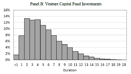 “the duration of investments is highly variable, more so in VC. While the median duration is five years … there is a long “tail” of investments that take much longer more than the typical ten-year assumed life of a PE fund, with a small percent stretching to 15 years or more.”