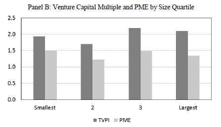 “Average TVPIs trend up slightly with duration while average PMEs hold steady above 1.0. This pattern in VC may reflect the sequential nature of financing as well as the heterogeneity of holdings within the venture space and the longer time it takes to build a young company.”